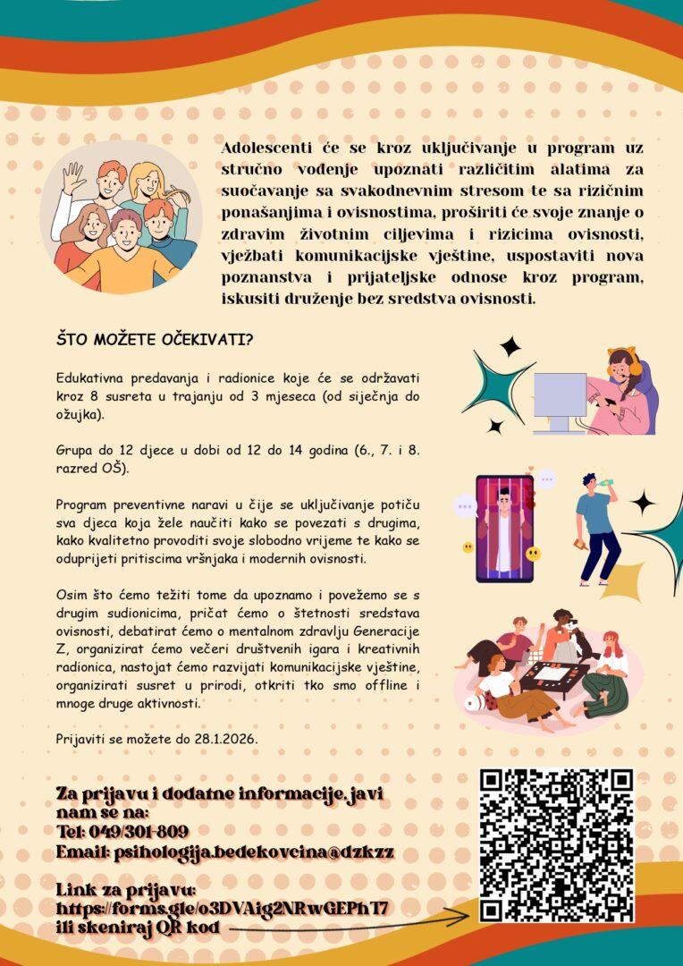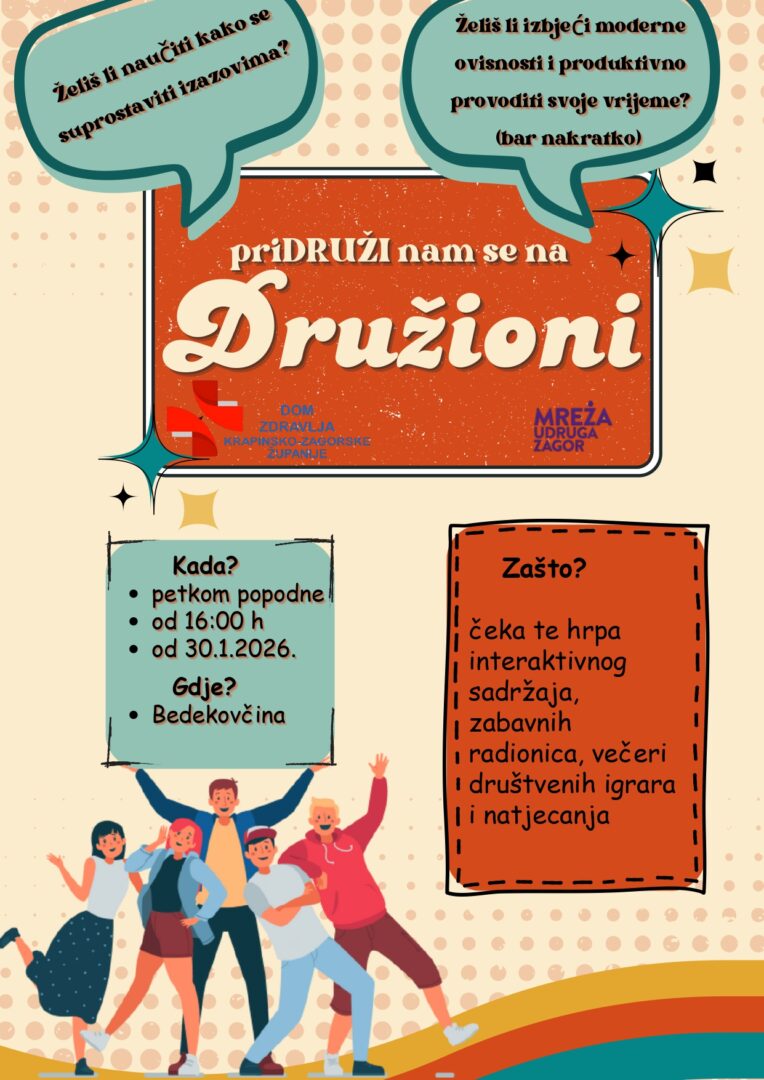 Dom zdravlja KZŽ u suradnji s Mrežom udruge Zagor organizira drugi ciklus radionica za mlade od 12 do 14 godina (u pravilu od 6. do 8. razreda OŠ) na temu prevencije ovisnosti i međusobne komunikacije i suradnje.