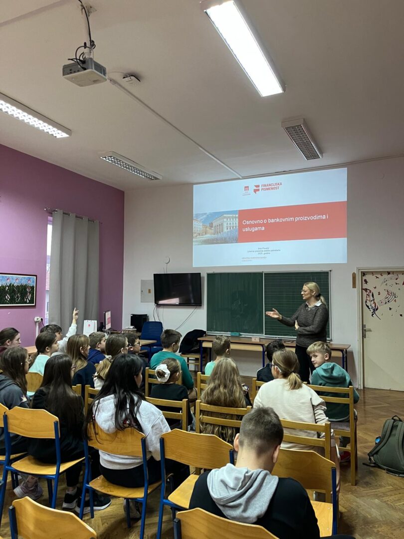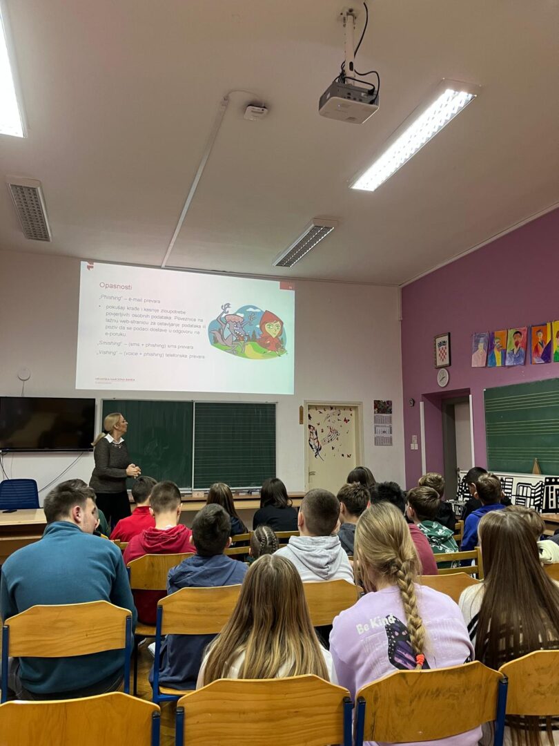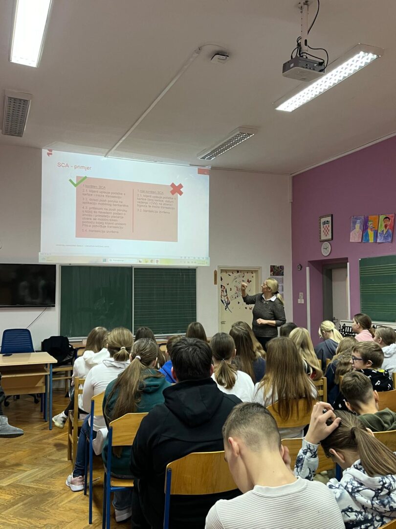 Učenici 7. i 8. razreda prisustvovali su predavanju “Sigurnost internetskih i mobilnih plaćanja”, dok su učenici 5. i 6. razreda slušali predavanje “Osnovno o bankovnim proizvodima i uslugama”. Predavanja je vodila gospođa Ana Pisačić, savjetnica u Uredu za praćenje zaštite potrošača Hrvatske narodne banke.