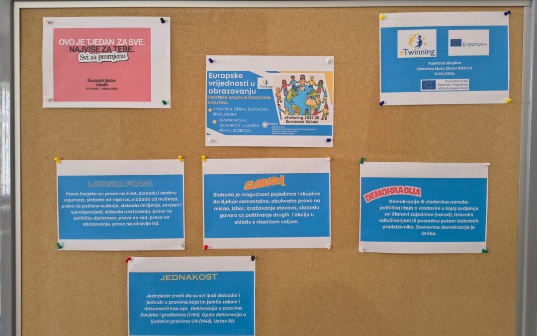 Europska komisija svake dvije godine organizira tematski tjedan kako bi mlade u Europi i svijetu potaknula na aktivno sudjelovanje u građanskom životu. Europski tjedan mladih traje od 24. travnja do 1. svibnja 2026., a ove godine posvećen je solidarnosti i pravednosti. Učenici Projektne skupine sa školskom knjižničarkom Snježanom Kovačević obilježili su ga uređenjem panoa i isticanjem ljudskih vrijednosti kao što su demokracija, sloboda, ljudska prava i jednakost kako bi sve učenike i učitelje škole potaknuli na poštivanje i uvažavanje ovih temeljnih ljudskih prava. Aktivnost je provedena u okviru Erasmus+ projekta EU Values in Education koji se u školi provodi ove školske godine. Na poveznici se nalazi više informacija o Europskom tjednu mladih: https://youth.europa.eu/youthweek_hr, a Osnovna škola Zlatar Bistrica jedina je škola iz Krapinsko- zagorske županije koja je prijavila program na službenoj stranici toga događanja.