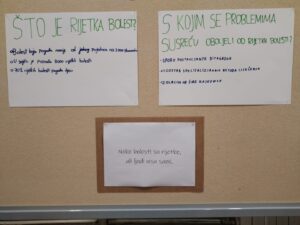 Vrijedan doprinos obilježavanju ovoga dana svojim su umjetničkim izričajem dali učenici polaznici Likovne skupine naše škole. Različitim likovnim tehnikama izrazili su podršku osobama koje žive s rijetkim bolestima te skrenuli pozornost na probleme i prepreke s kojima se svakodnevno susreću. Njihovi radovi progovaraju o važnosti razumijevanja i prihvaćanja, ali i o snazi, hrabrosti i ustrajnosti oboljelih.