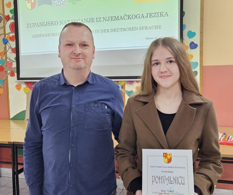 Županijsko natjecanje iz njemačkog jezika održano je 23. veljače 2026. godine u Osnovnoj školi Ante Kovačića u Zlataru. Iz naše škole na županijsko natjecanje plasirala se učenica 8. razreda Klara Tomić, te je u kategoriji I (program učenja jezika od 1. razreda osnovne škole) osvojila šesto mjesto (od sveukupno 10 natjecatelja). Učenicu je za natjecanje pripremao profesor njemačkog jezika Vladimir Matejaš.